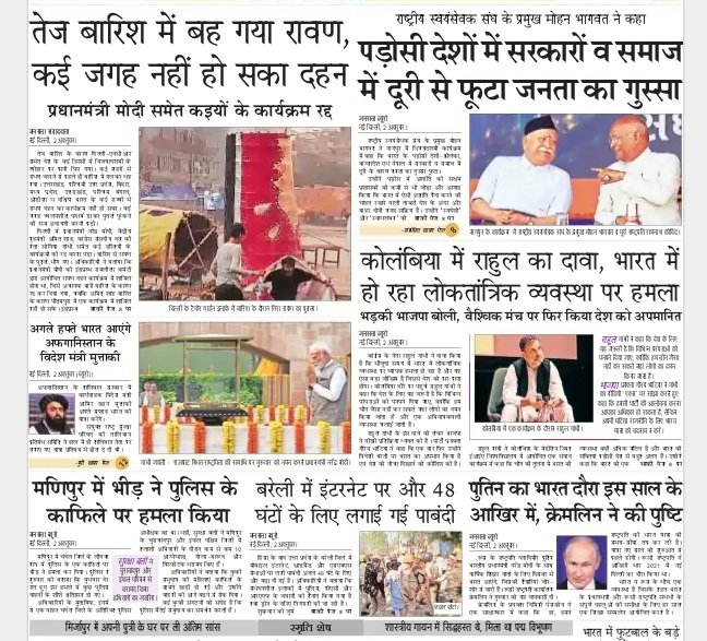 राष्ट्रीय स्वंय सेवक संघ के प्रमुख मोहन भागवत का यह बयान कि लोकतांत्रिक तरीके से ही बदलाव संभव, हिंसा से नहीं होता कोई लाभ अमर उजाला में प्रमुखता से है। दैनिक जागरण ने उनके इस कथन को पहली खबर बनाया है कि स्वदेशी और स्वावलंबन का कोई विकल्प नहीं है।