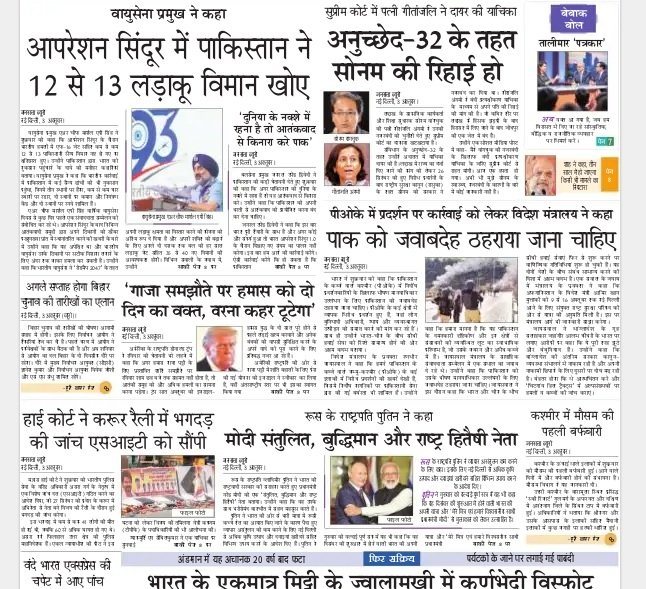 सेना प्रमुख जनरल उपेन्द्र द्विवेदी और वायु सेना प्रमुख अमरप्रीत सिंह का बयान आज के अखबारों में छाया हुआ है। अमर उजाला लिखता है- जनरल द्विवेदी ने कहा- दुनिया के नक्शे में रहना है तो आतंक को बढ़ावा देना बंद करे पाकिस्तान। लोकसत्य की सुर्खी है- पाक को चेतावनी-नक्शे से मिटा देंगे नामोनिशां। दैनिक भास्कर ने एयर फोर्स चीफ के हवाले से लिखा है- पाकिस्तान का भारतीय जेट गिराने का दावा मनोहर कहानियां। हमने पाक के तेरह जेट मार गिराए, इनमें अमेरिकी एफ-16, चीनी जेएफ-17 भी। जनसत्ता की भी ऐसी ही सुर्खी है।
