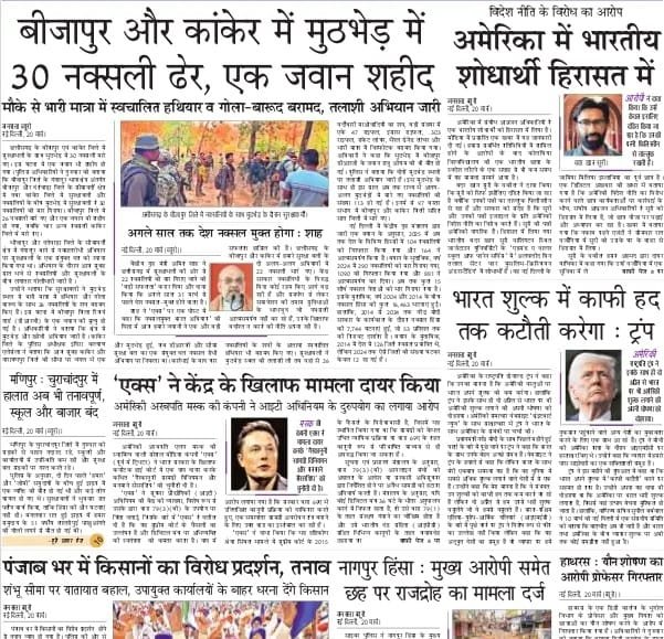 छत्तीसगढ़ में सुरक्षाबलो के साथ मुठभेड़ में नक्सलियों के मारे जाने की खबर आज सभी समाचार पत्रों के पहले पन्ने पर है। जनसत्ता लिखता हैं – बीजापुर और कांकेर में मुठभेड, तीस नक्सली ढेर, एक जवान शहीद। नवभारत टाइम्स की सुर्खी है – नक्सलियों पर साल का दूसरा बड़ा ऐक्शन, सात घंटे चला ऑपरेशन, एक जवान शहीद।