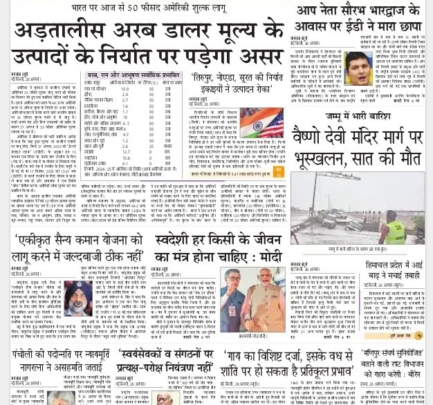 आज से भारतीय उत्पादों पर पचास फीसद अमरीकी टैरिफ लगने वाला समाचार भी राष्ट्रीय सहारा, दैनिक ट्रिब्यून, वीर अर्जुन और जनसत्ता सहित कई अखबारों ने पहले पन्ने पर दिया है।