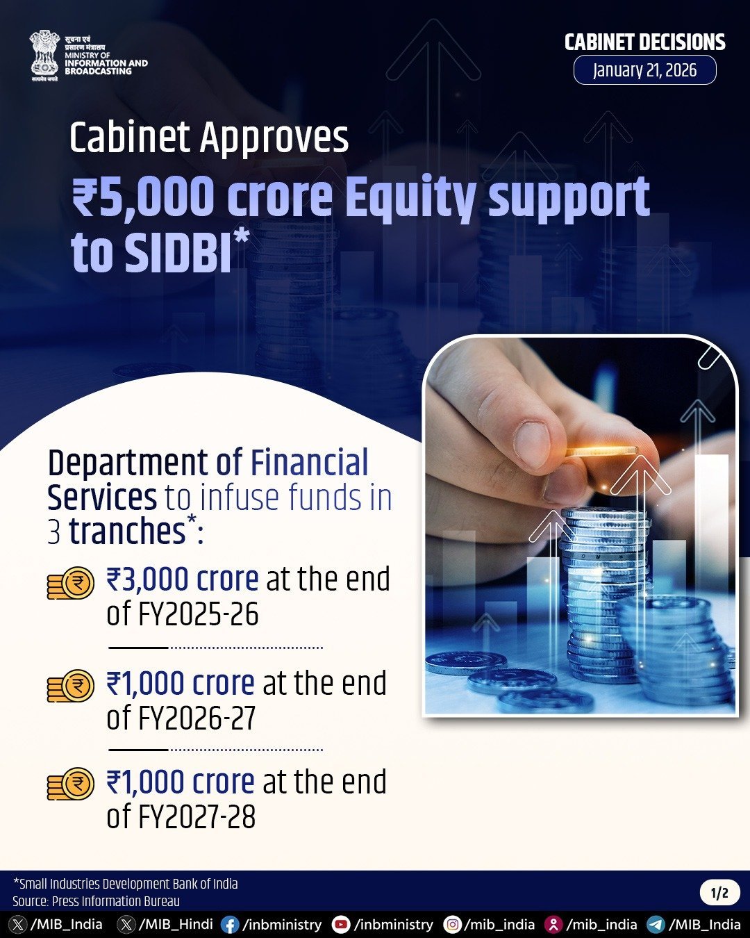 प्रधानमंत्री नरेन्द्र मोदी की अध्यक्षता में केंद्रीय मंत्रिमंडल ने भारतीय लघु उद्योग विकास बैंक (सिडबी) को 5,000 करोड़ रुपये की इक्विटी सहायता को मंजूरी दे दी है।
