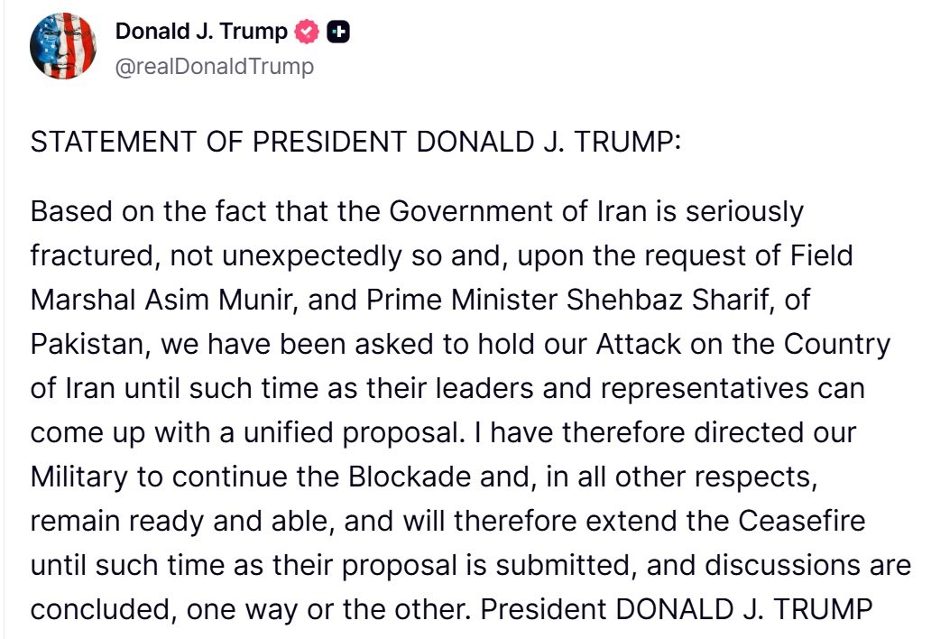 राष्ट्रपति ट्रम्प ने बताया कि पाकिस्तान के अनुरोध पर यह निर्णय लिया गया है। साथ ही, उन्होंने यह भी कहा जब-तक ईरान कोई साझा प्रस्ताव पेश नहीं करता, तब-तक ईरान के बंदरगाहों की नाकाबंदी जारी रहेगी।