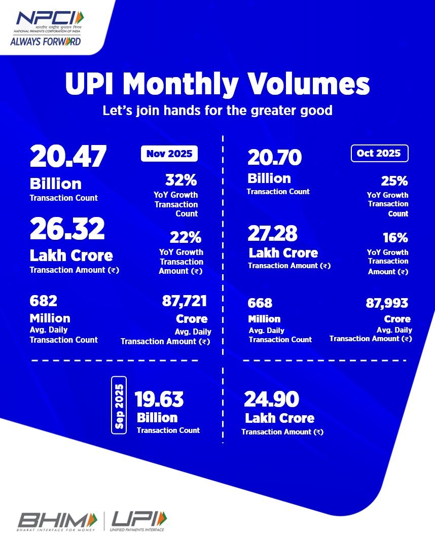 यूनिफाइड पेमेंट्स इंटरफेस-यूपीआई ने पिछले महीने एक हजार नौ सौ करोड लेन-देन का आंकडा पार किया। यह पिछले वर्ष की तुलना में लेन-देन की संख्या में 32 प्रतिशत की साल-दर-साल वृद्धि को दर्शाता है। इसके अलावा लेन-देन के मूल्य में 22 प्रतिशत की वार्षिक वृद्धि भी दर्ज की गई।