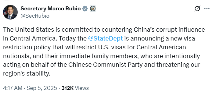अमरीका ने चीन की कम्युनिस्ट पार्टी के लिए काम करने और कानून को कमजोर रहने के आरोप में, मध्य अमरीका के कुछ नागरिकों पर वीज़ा प्रतिबंध लगा दिए हैं। इनमें बेल्ज़ि, कोस्टारिका, एल सल्वाडोर, ग्वाटेमाला, होंडुरास, निकारागुआ और पनामाम के नागरिक शामिल हैं।