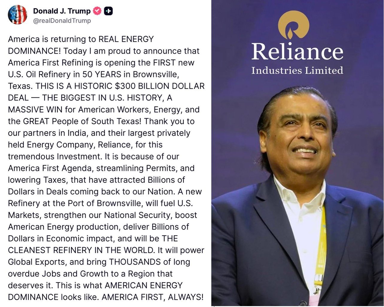 अमरीका के राष्ट्रपति डॉनल्ड ट्रम्प ने घोषणा की है कि रिलायंस इंडस्ट्रीज के निवेश से अमरीका को 50 वर्षों में अपनी पहली तेल रिफाइनरी मिलेगी। राष्ट्रपति ट्रम्प ने कहा कि टेक्सास के ब्राउनस्विले बंदरगाह पर बनने वाली यह नई रिफाइनरी अमरीका के बाजारों को ईंधन प्रदान करेगी, राष्ट्रीय सुरक्षा को मजबूत करेगी, अमरीकी ऊर्जा उत्पादन को बढ़ावा देगी और हजारों रोजगार सृजित करेगी। रिलायंस इंडस्ट्रीज की ओर से इस सौदे पर अभी तक कोई आधिकारिक बयान नहीं आया है।
