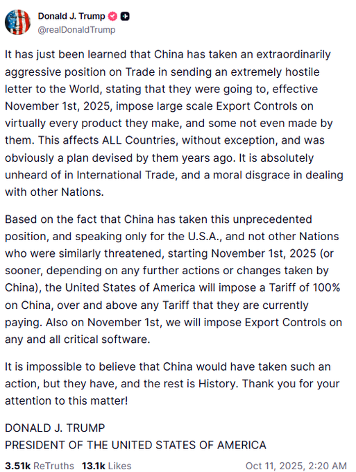अमेरिकी राष्ट्रपति डोनाल्ड ट्रम्प ने चीन पर 100% टैरिफ लगाने की घोषणा की है, जो वर्तमान में चीन पर लागू टैरिफ के अतिरिक्त होगा, तथा 1 नवंबर से सभी महत्वपूर्ण सॉफ्टवेयर पर निर्यात नियंत्रण लागू होगा।